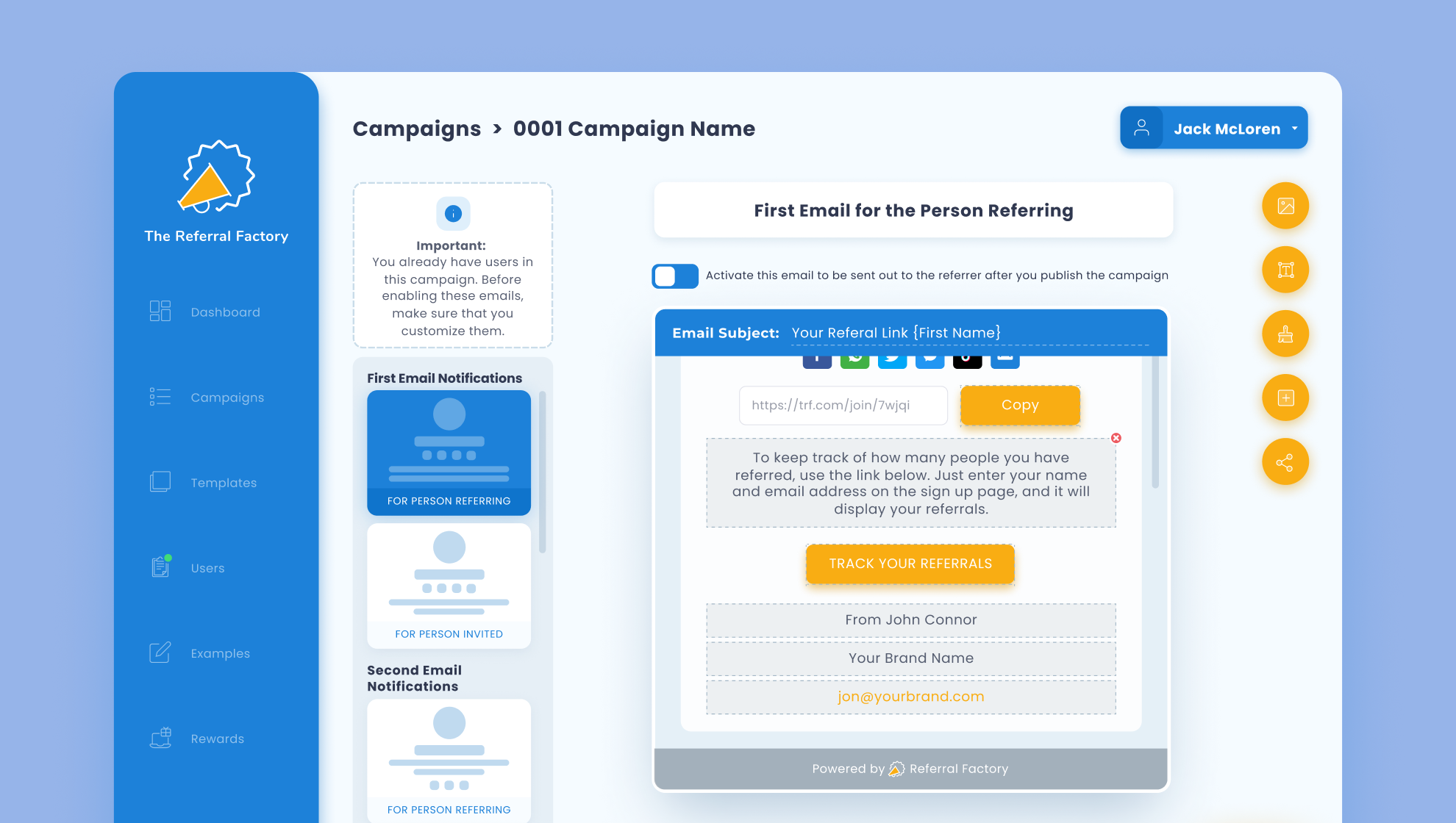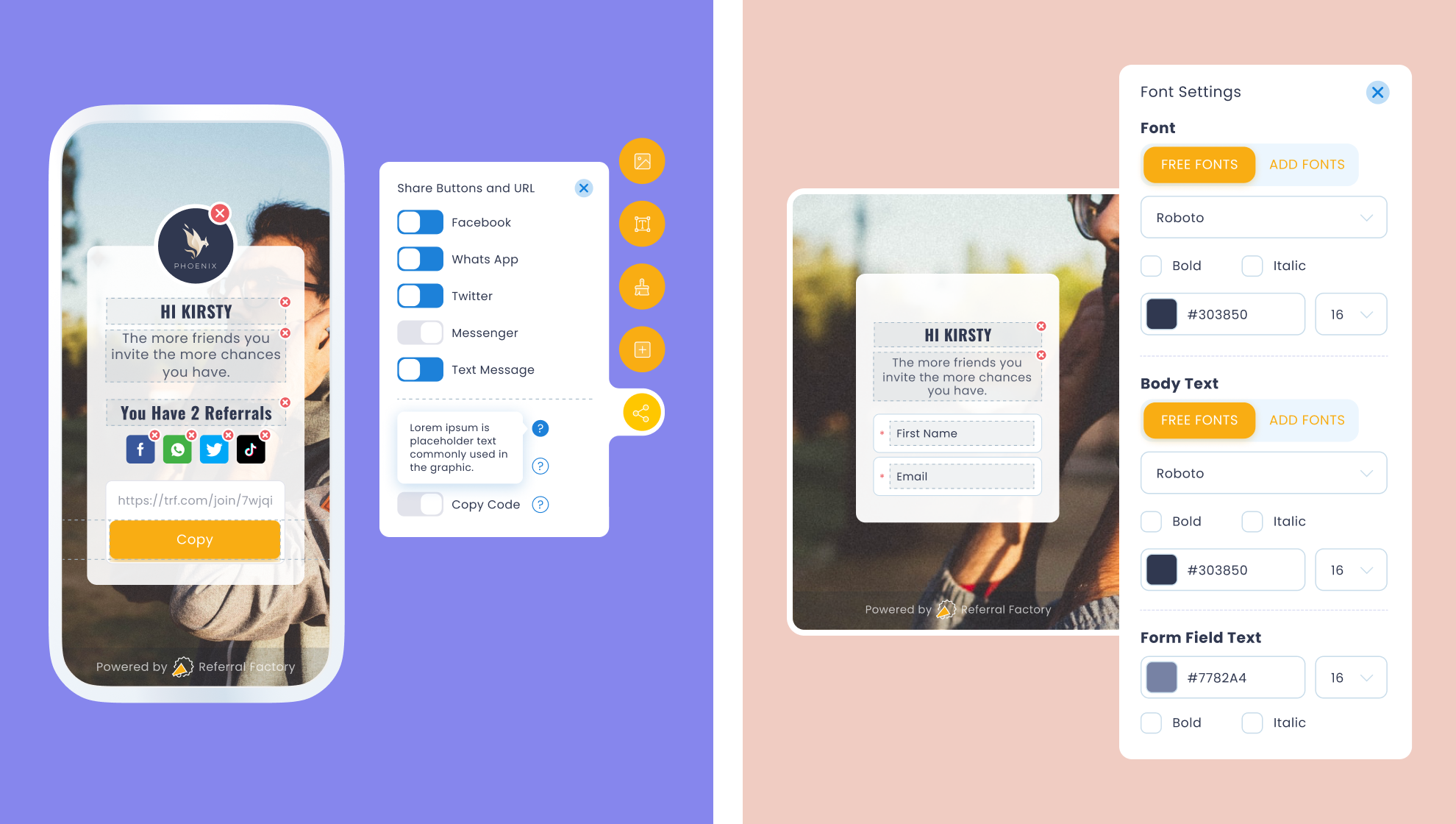 With Referral Factory you can build fully customizable mobile responsive landing pages, funnels, email newsletters and SMS distributions; set single-sided, double-sided or custom referral campaigns; run campaigns for existing customers or make them public; share custom URLs, coupon codes, QR codes, widgets and buttons; set different types of rewards and track and monitor who joined your campaigns, how many friends they have referred, and how many of those have converted.